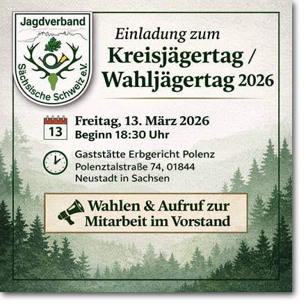 Sehr geehrte Weidgenossinnen, sehr geehrte Weidgenossen, werte Gäste, Der Vorstand des Jagdverbandes Sächsische Schweiz e.V. lädt Sie recht herzlich zu unserem Verbandstag ein. Weitere Informationen im Terminkalender.